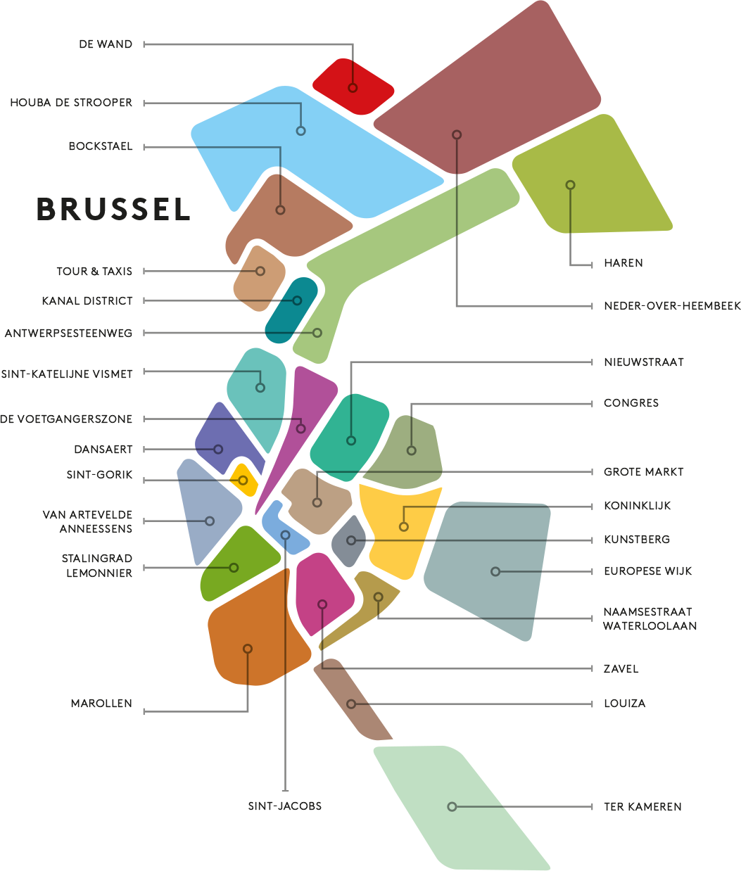 Je denkt dat je, naar het beeld van de Grote Markt, een oude stad ontdekt, maar ineens stuit je op de creatieve moderniteit van de winkels in de Dansaertstraat. Je neemt een middeleeuws steegje en verzeilt plotsklaps in de Europese wijk met zijn uitstraling van Little Manhattan. Zonder het in de mot te hebben, kom je vanaf de erg aristocratische Zavel in de volkse Marollen terecht. En als je iets verder weg de historische kern verlaat, ontdek je dorpswijken zoals Laken…